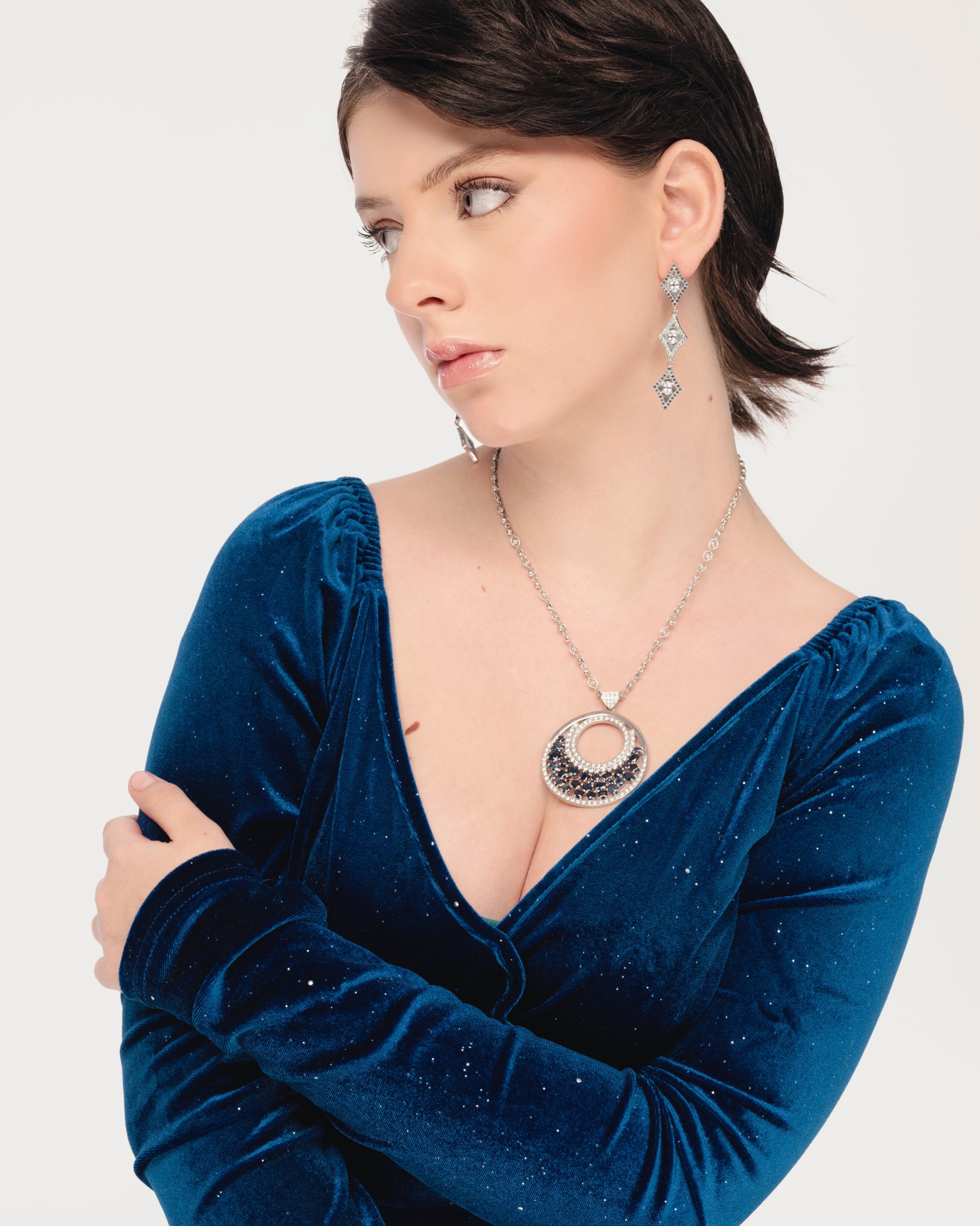 Tosca Pendant handcrafted in rhodium plated 925 sterling silver, with natural sapphires and white cubic zirconia. A jewel that combines classic elegance and artisan craftsmanship.